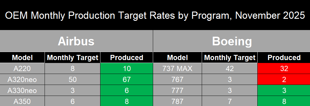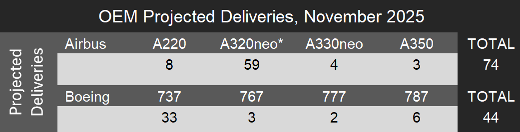 - Delivery data is the expected number that Boeing and Airbus will report in their November 2025 Orders and Deliveries summary and is based on Forecast International’s internal research. Numbers are not official and are not provided by Airbus or Boeing.