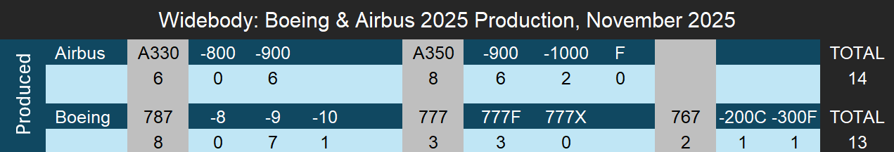 - Production data represents the actual number of aircraft produced in November 2025. Forecast International considers an aircraft produced upon its first flight. This may differ from an OEM’s definition of produced.