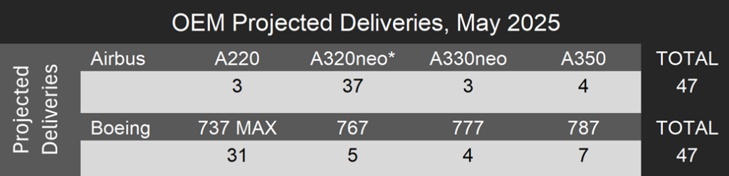 In May 2025, the commercial aircraft delivery landscape continued to show signs of stagnation due to ongoing supply chain constraints that are limiting increases in production rates at Airbus and Boeing.