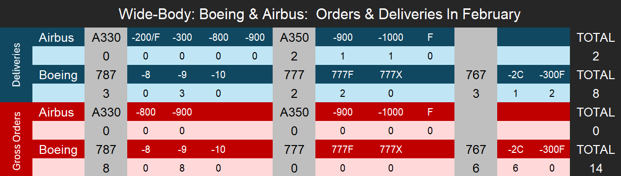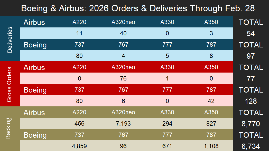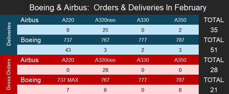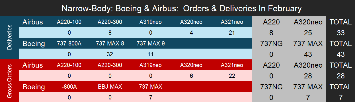 Boeing Leads February Deliveries for Second Consecutive Month // Airbus Outpaces Boeing on Orders // Narrowbody Activity Dominates